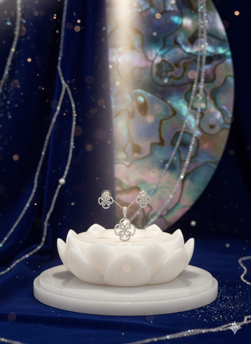 The Florentia Luxe Set captures the poetry of petals in motion — a pendant and earring duo adorned with intricate filigree curves and shimmering cubic zirconia stones. Its elegant floral motif radiates a royal charm, perfect for adding sparkle to any celebration or soirée.