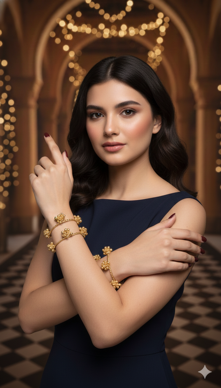 Inspired by the regal beauty of Kashmiri craftsmanship, this bangle features delicate floral clusters meticulously arranged along a twisted gold band. Every petal captures the charm of heritage jewellery, reimagined for today’s modern woman. Lightweight, statement-making, and exquisitely detailed — it’s the perfect fusion of tradition and Gen-Z glamour. Pair it solo or stack it for a bold festive look.