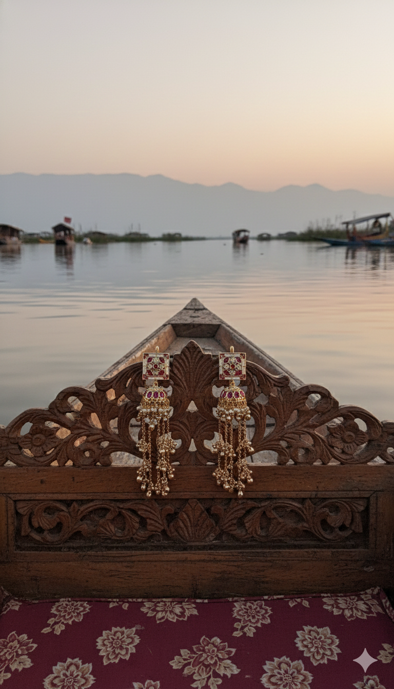 The Ruhani Ruby Heritage Earrings blend bold geometry with intricate craftsmanship. Featuring ruby-red kundan accents, jhumka detailing, and cascading gold chains with ghungroo drops, these earrings add an instant royal touch — perfect for festive and bridal looks steeped in Kashmiri artistry.