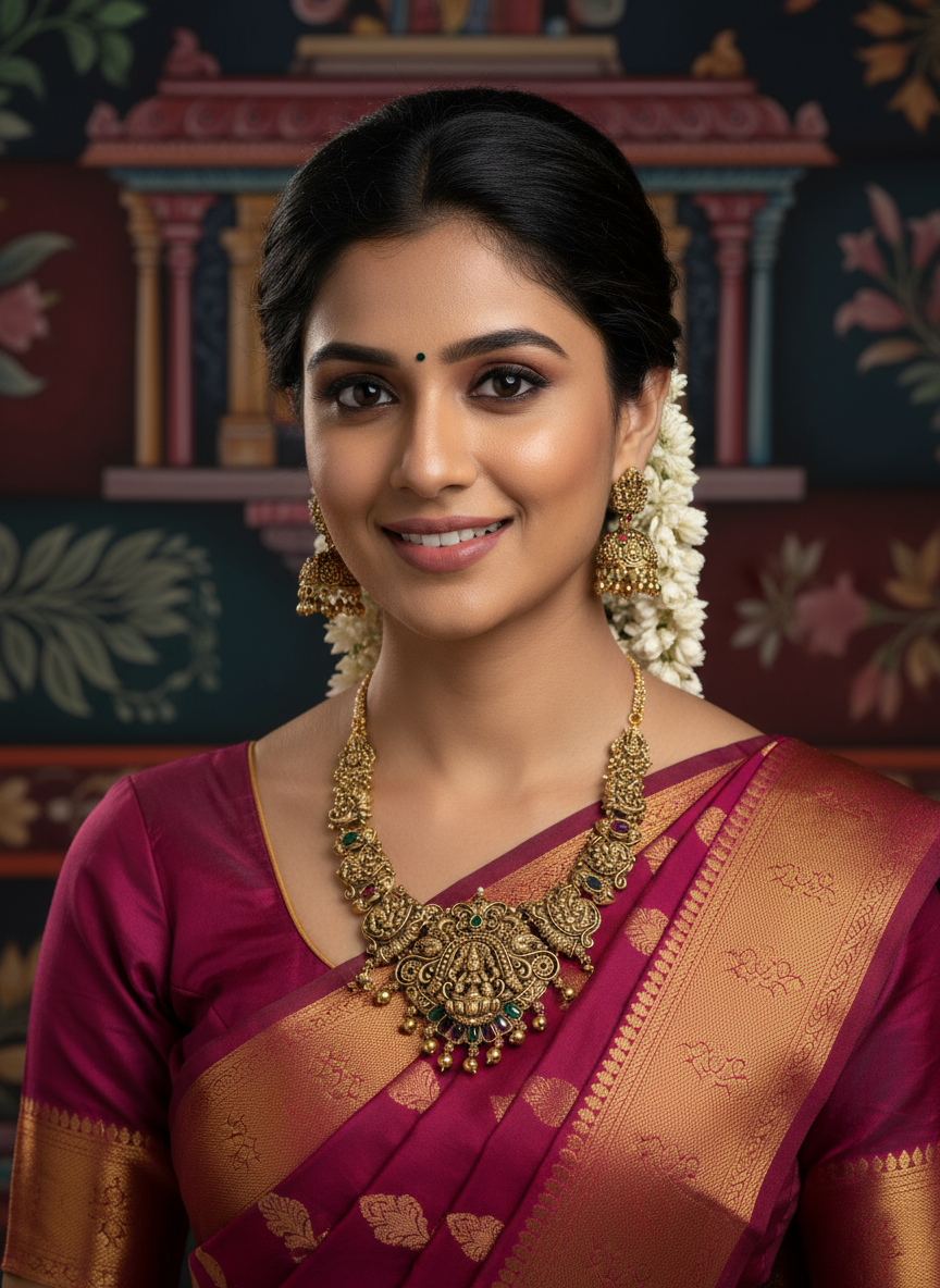 Embrace divine grace and royal heritage with the “Devi Varnam Vaddanam,” a traditional temple jewelry nexklace inspired by South Indian artistry. Handcrafted with intricate antique gold finishes, this vaddanam features elaborately carved goddess Lakshmi motifs surrounded by floral and peacock designs, highlighted with vibrant semi-precious stones in red and green. Finished with classic gold beads and detailed filigree accents, this piece is ideal for weddings and festive occasions, radiating spiritual elegance and timeless grandeur. Perfect for complementing sarees and lehengas, the “Devi Varnam Vaddanam” transforms every celebration into a regal affair.