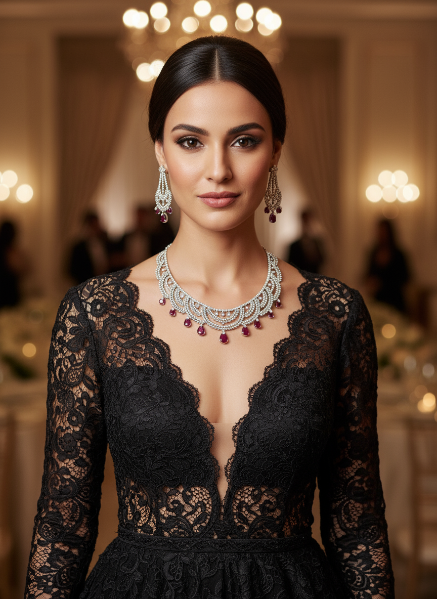 The Scarlet Cascade features rows of prong-set American diamonds, arranged in undulating waves that flow effortlessly into ruby-hued teardrops. Each gemstone captures the play of light like ripples on the sea’s surface. Matching earrings echo the same graceful rhythm, completing this ensemble of liquid luxury.