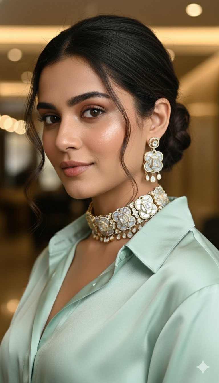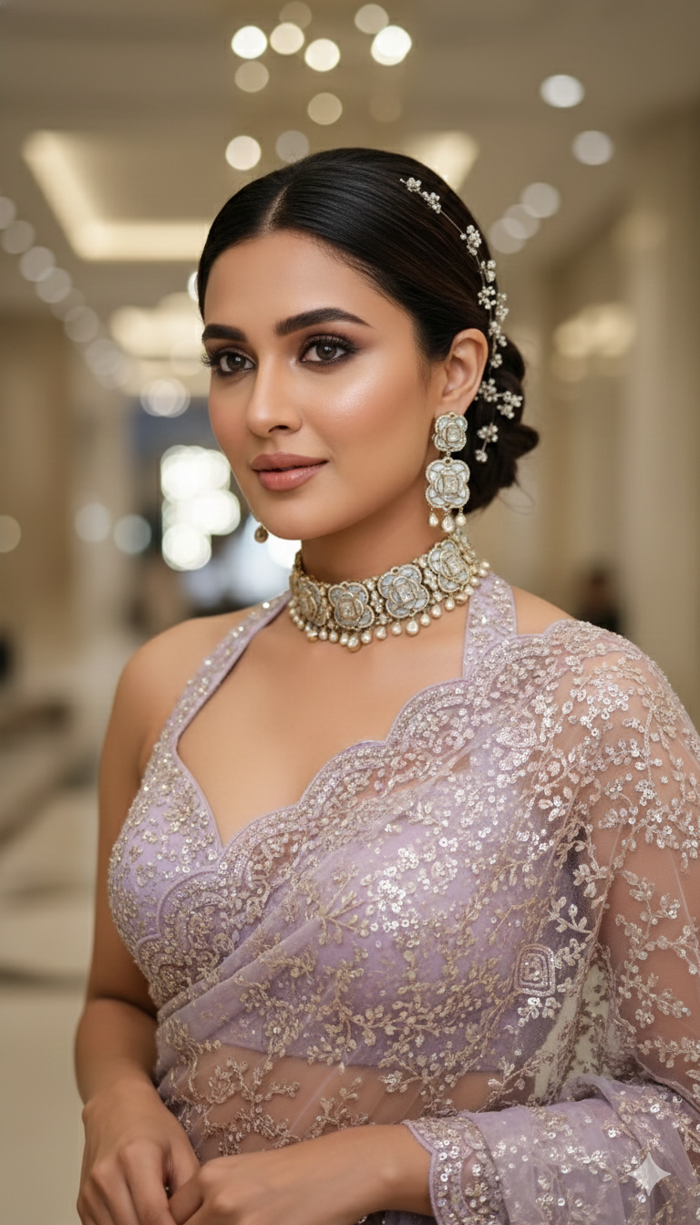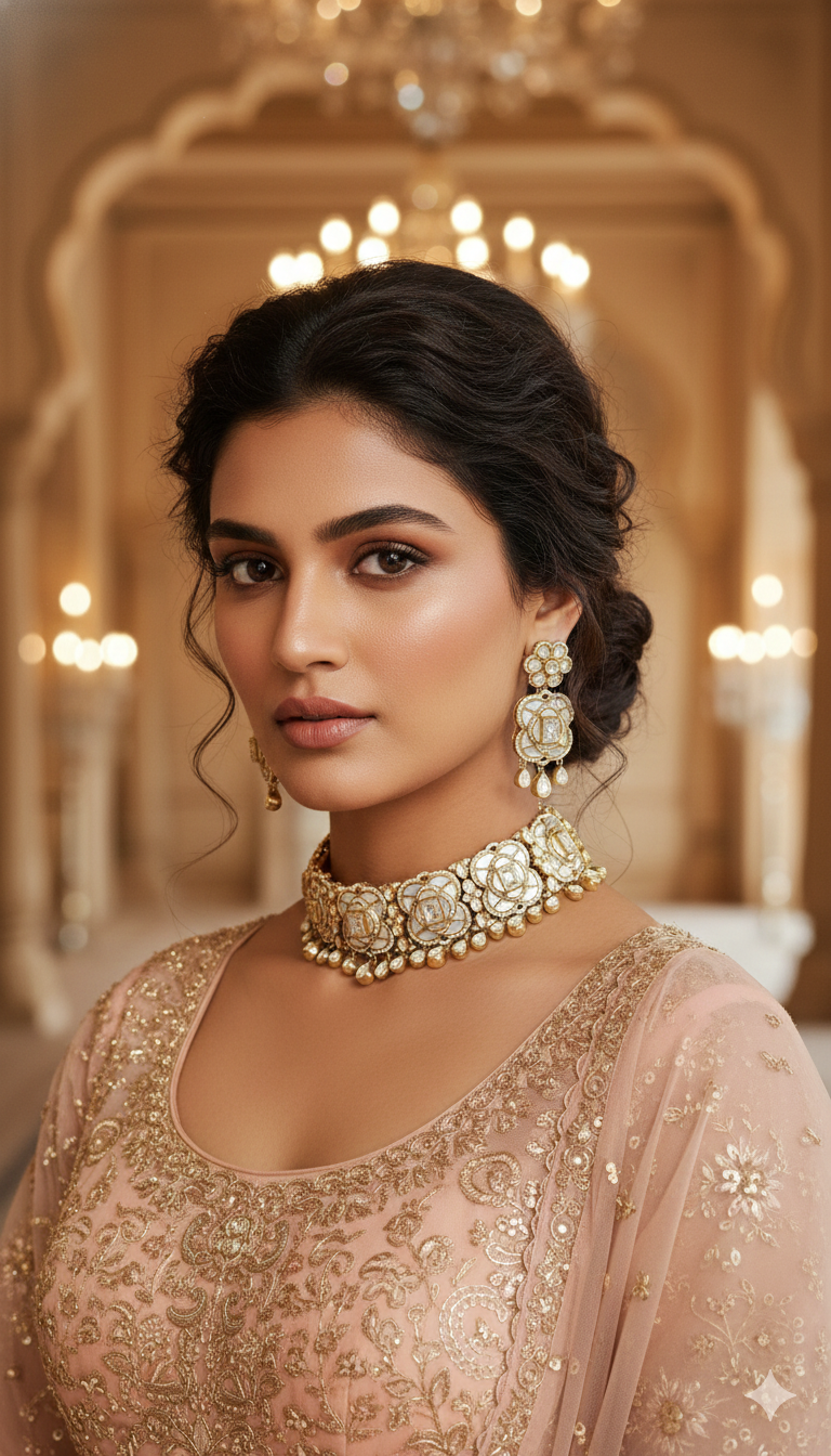 Pair with pastel lehengas, silk sarees, or draped gowns for an ethereal festive look.